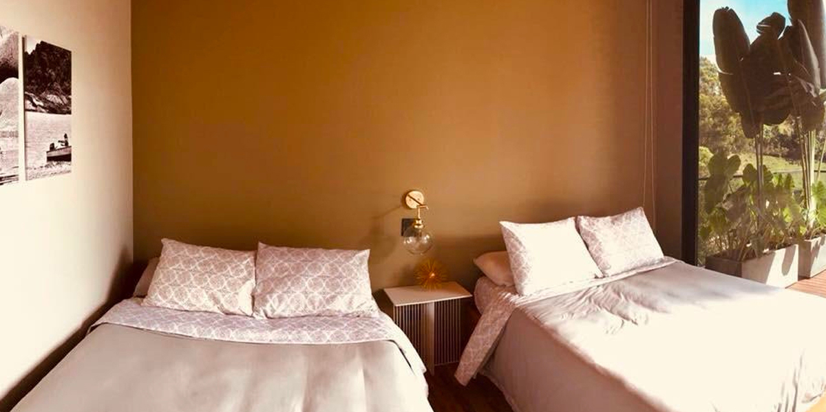 A room with a double bed and an additional bed underneath, bathroom, TV and balcony overlooking the dam.